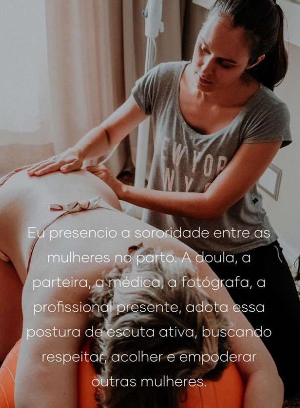 Eu presencio a sororidade entre as mulheres no parto. A doula, a parteira, a médica, a fotógrafa, a profissional presente, adota essa postura de escuta ativa, buscando respeitar, acolher e empoderar outras mulheres.